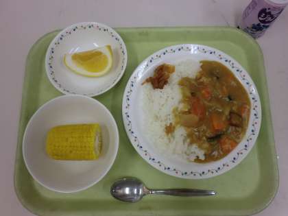 今日の給食は、夏野菜のカレーライス、ジョア、福神漬、とうもろこし、河内晩柑です。