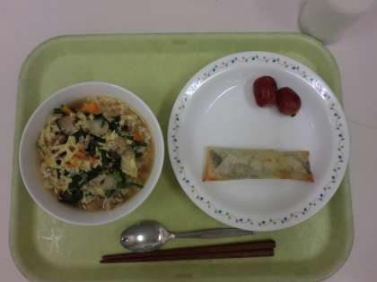 今日の給食は、クッパ、牛乳、棒餃子、ぶどう(甲斐路)です。