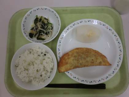 今日の給食は、菜めし、牛乳、ジャンボぎょうざ、和風サラダ、梨です。