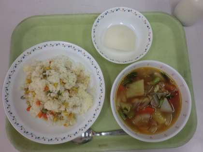 今日の給食は、三色ピラフ、牛乳、ミネストローネ、梨です。
