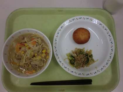 今日の給食は、サッポロラーメン、牛乳、野菜の中華かけ、おからドーナツです。