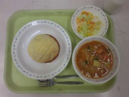 今日の給食は、手作りメロンパン、牛乳、ハンガリアンシチュー、コーンサラダです。