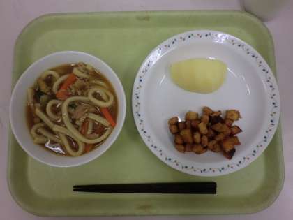 今日の給食は、カレーうどん、牛乳、イカとさつま芋の揚げ煮、りんごです。