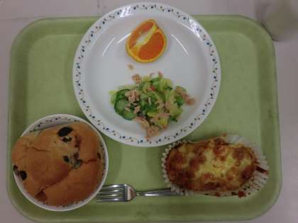 今日の給食は、ぶどうパン、牛乳、ポテトグラタン、ツナサラダ、早香です。