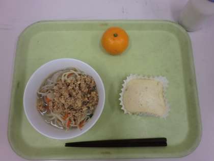 今日の給食は、担々麺、牛乳、照り焼きまん、みかんです。