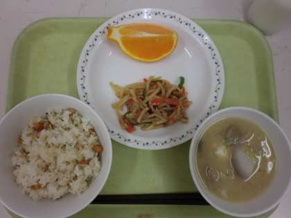今日の給食は、豆ごはん、牛乳、いわしのつみれ汁、じゃがいものきんぴら、デコポンです。