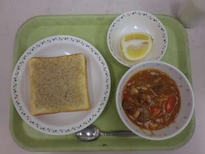 今日の給食は、セサミトースト、牛乳、チリビーンズシチュー、はるかです。