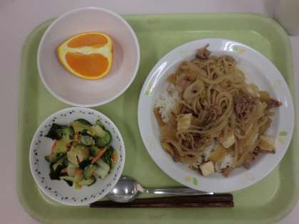 今日の給食は、豚丼、牛乳、わかめサラダ、清見オレンジです。