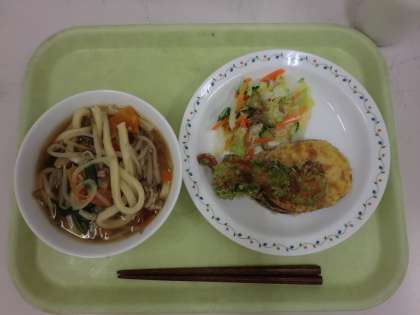 今日の給食は、ちゃんこうどん、牛乳、さつまいもの天ぷら、ちくわの磯辺揚げ、ごぼうチップサラダです。