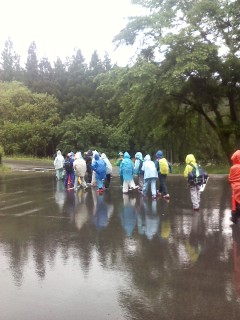 村めぐりへ出発です。雨が少し降っています。