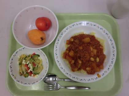 今日の給食は、チリビーンズライス、牛乳、イタリアンサラダ、プラムまたはびわです。