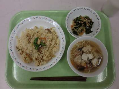 今日の給食は、とりめし、牛乳、七夕汁、和風サラダです。