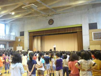 初めに校長先生から、先週の土曜日、本校で行われた「こどもまつり」についてお話がありました。あいにくのお天気でしたが、たくさんの人達が集まり賑わいをみせた「こどもまつり」。その裏側は、多くの地域の方や、本校PTA、卒業生の方々など、たくさんの人たちに支えられていたことについてお話されました。また、農大の応援団の演技からは「あきらめない気持ち」を学ぶことができたこともお話をされました。地域や保護者の方々のご協力により、充実した教育活動を行うことができています。