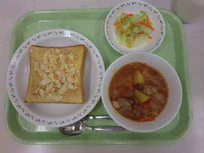 今日の給食は、アーモンドトースト、牛乳、トマトシチュー、コーンサラダです。
