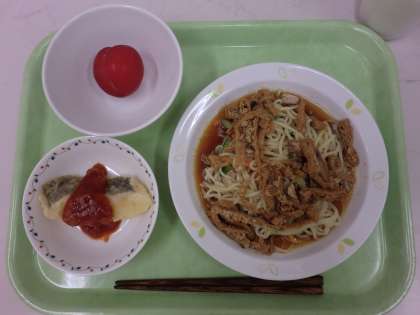 今日の給食は、冷やし中華、牛乳、魚のチリソース、プラムです。