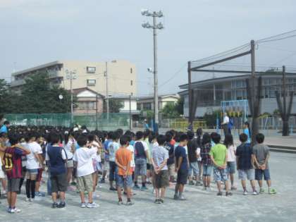 7月14日(月)校庭にて全校朝会が行われました。はじめに校長先生から、44日間の長い夏休みについて二つの話がありました。一つは、「普段できないことに計画的に挑戦しましょう。」ということ、もう一つは、「朝のラジオ体操に参加するなど体力つくりにも取り組みましょう。」ということでした。