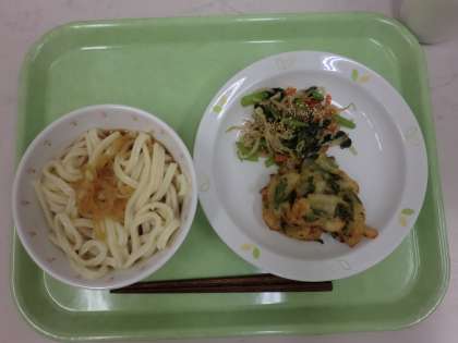 今日の給食は、冷やしうどん、牛乳、かきあげ、野菜のごまあえです。