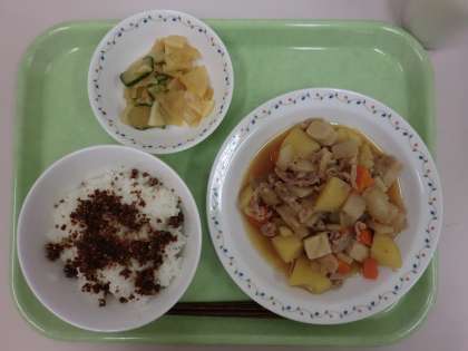 今日の給食は、ごはん、牛乳、肉じゃがうま煮、かつおでんぶ、ピリカラ大根です。