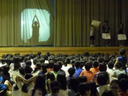 9月5日(金)朝、体育館にて児童集会が行われました。今日の内容は「シルエットクイズ」。動いている様子や影の形から先生をあてる3択クイズでした。集会委員が中心となって司会をしたり問題を出したりと、準備から片付けまで、児童が行いました。