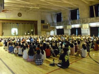先生がおもいおもいの動きや道具を使うと子どもたちからは歓声が上がり、楽しい集会になりました。