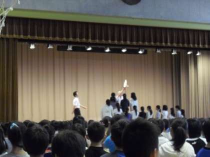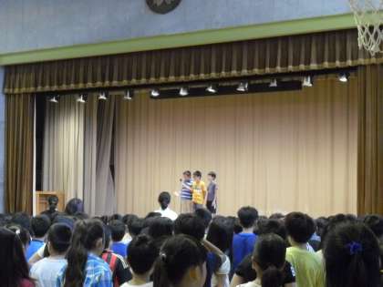 9月8日(月)朝、体育館にて全校朝会が行われました。初めに、環境ポスターとバスケットボールの表彰があり、校長先生からテニスの錦織選手の功績も例に、がんばったことは他の人の勇気や力になるというお話がありました。