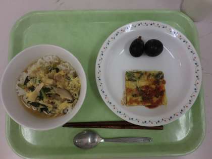 今日の給食は、クッパ、牛乳、チヂミ、巨峰です。
