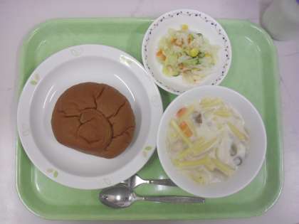 今日の給食は、ココアパン、牛乳、マカロニのクリーム煮、ゆで野菜のドレッシングかけです。