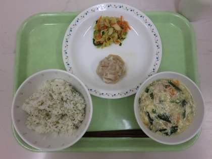 今日の給食は、じゃこと青のりのごはん、牛乳、ジャンボしゅうまい、白菜のおかかかけ、にらたまスープです。