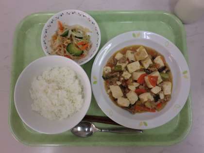 今日の給食は、ごはん、牛乳、家常豆腐、もやしのコチュジャンかけです。