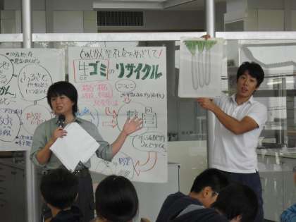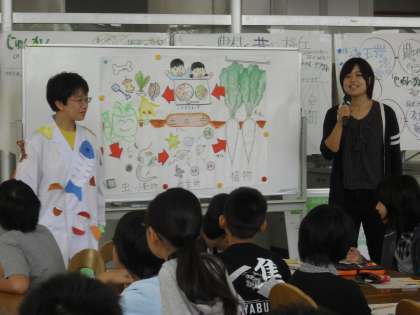 10月27日(月)1・2時間目にランチルームにて家庭科の出前授業を行いました。講師に、桜丘一丁目の大江さん、東京農業大学の学生さん、JA世田谷目黒の方々をお招きしました。桜丘の農地としての歴史や、給食の残飯から農大で「みどりくん」という肥料が作られ、その肥料で育った野菜を給食で食べるという循環の仕組み、桜丘で栽培されている野菜の話など、「ふるさと桜丘」について楽しいクイズなども交えながらお話していただきました。