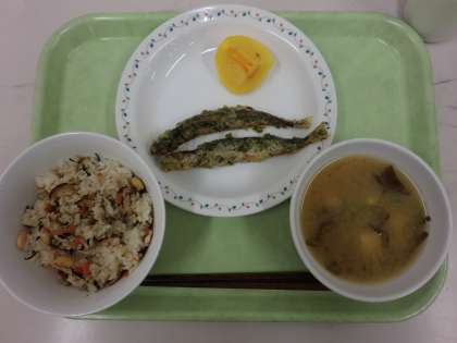 今日の給食は、豆入りひじきごはん、牛乳、ししゃもの磯辺揚げ、わかめの味噌汁、柿です。