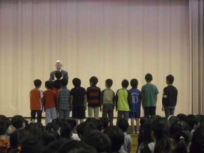 12月1日(月)朝、体育館にて全校朝会を行いました。はじめに、校長先生から多読賞とFC桜丘3年生の表彰がありました。