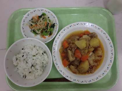 今日の給食は、わかめごはん、牛乳、韓国風肉じゃが、塩ナムルです。
