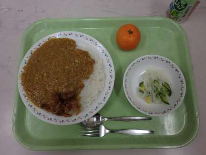 今日の給食は、キーマカレーライス・ジョア・大根サラダ・みかんです。