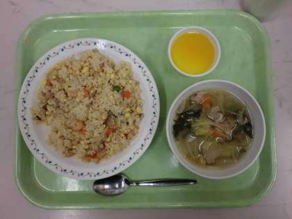 今日の給食は、チャーハン、牛乳、中華スープ、杏仁ゼリーピーチソースかけです。