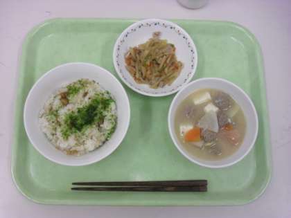 今日の給食は、豆ごはん、いわしのつみれ汁、じゃがいものきんぴらです。