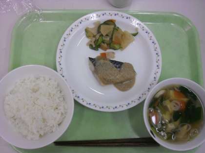 今日の給食は、ごはん、牛乳、魚のごまだれかけ、シャキシャキ野菜、すまし汁です。