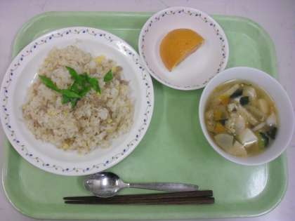 今日の給食は、三色丼、牛乳、吉野汁、清見オレンジです。