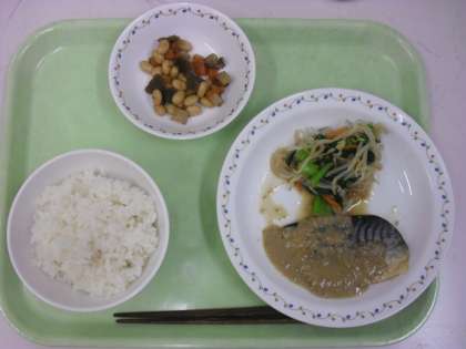 今日の給食は、ごはん、牛乳、魚のごまだれかけ、野菜のからししょうゆかけ、五目豆です。