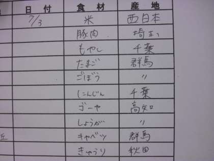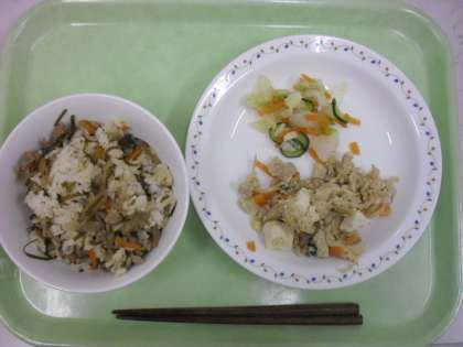 今日の給食は、豚肉とごぼうのごはん、牛乳、ゴーヤチャンプル、野菜の甘酢かけです。
