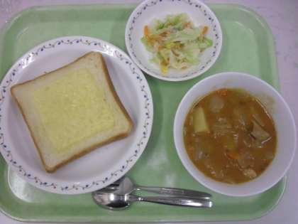 今日の給食は、チーズトースト、牛乳、トマトシチュー、コーンサラダです。