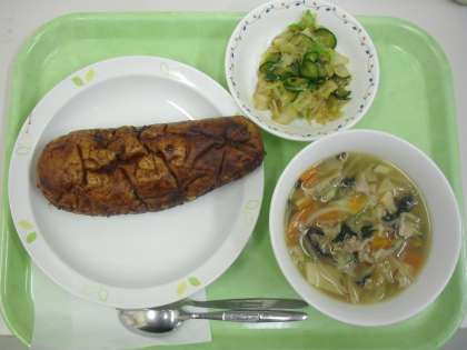 あげパン、牛乳、ワンタンスープ、野菜の中華かけです。