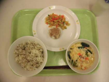 今日の給食は、じゃこと青のりのごはん、牛乳、ジャンボしゅうまい、白菜のおかかかけ、にらたまスープです。