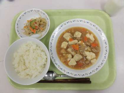 今日の給食は、ごはん、牛乳、家常豆腐、もやしのコチュジャンかけです。