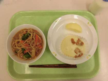 今日の給食は、担々麺、照り焼きまん、りんご、牛乳です。