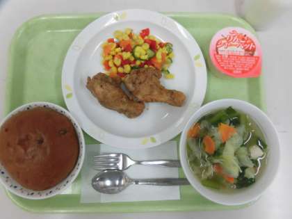 今日の給食は、チョコチップパン、フライドチキン、トロピカルサラダ、野菜スープ、シャーベット、牛乳です。
