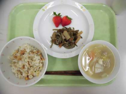 今日の給食は、豆ごはん、いわしのつみれ汁、茎わかめのきんぴら、いちご、牛乳です。