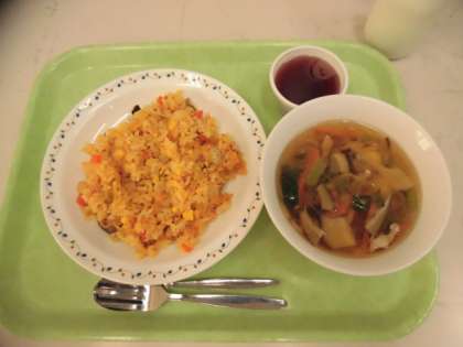 今日の給食は、キムチチャーハン、春雨スープ、ぶどうゼリー、牛乳です。