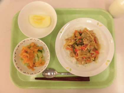 今日の給食は、スタミナ丼、パリパリサラダ、りんご、牛乳です。
