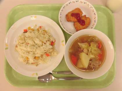 今日の給食は、コーンピラフ、豆腐のナゲット、白いんげんの田舎風スープ、牛乳です。